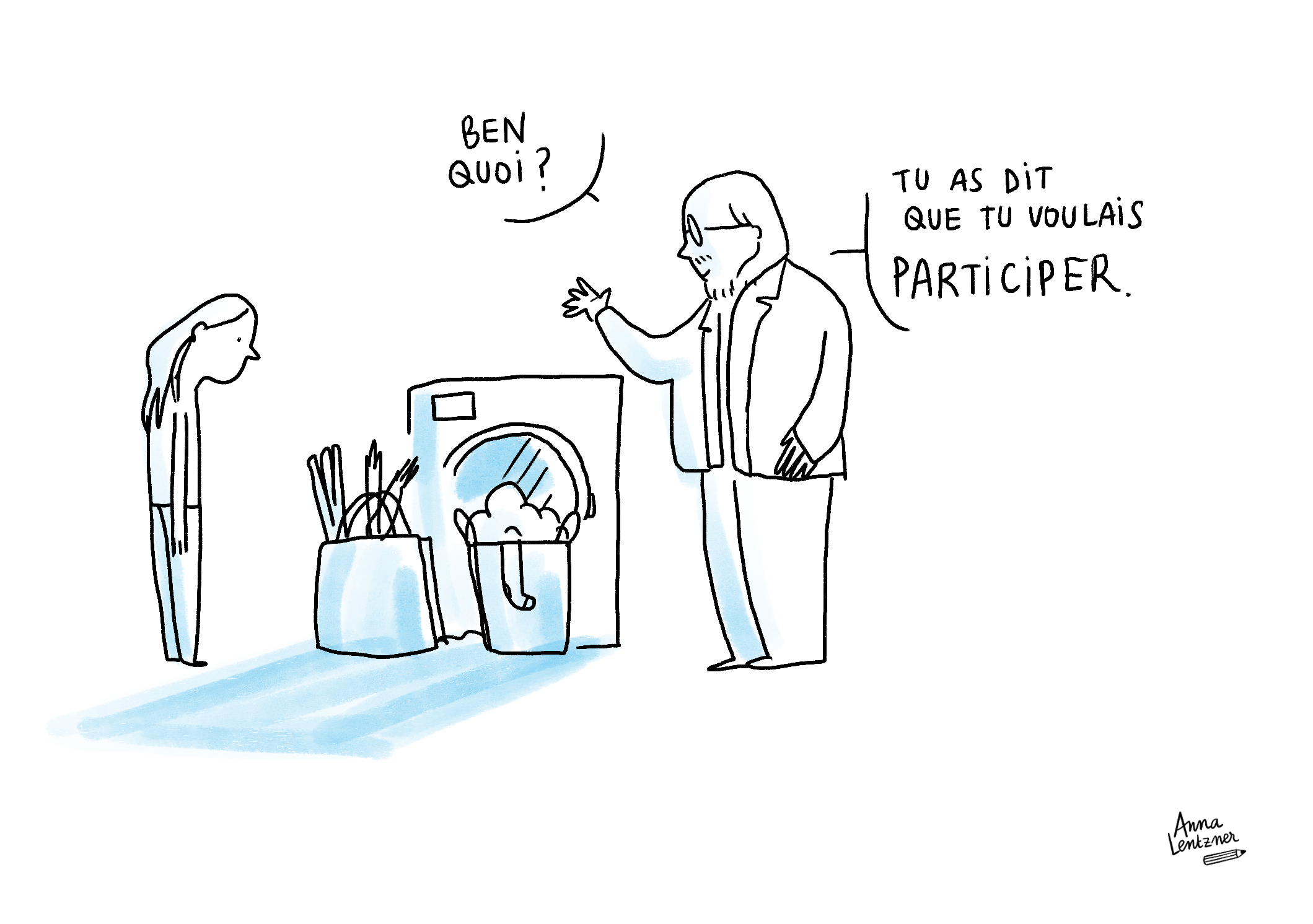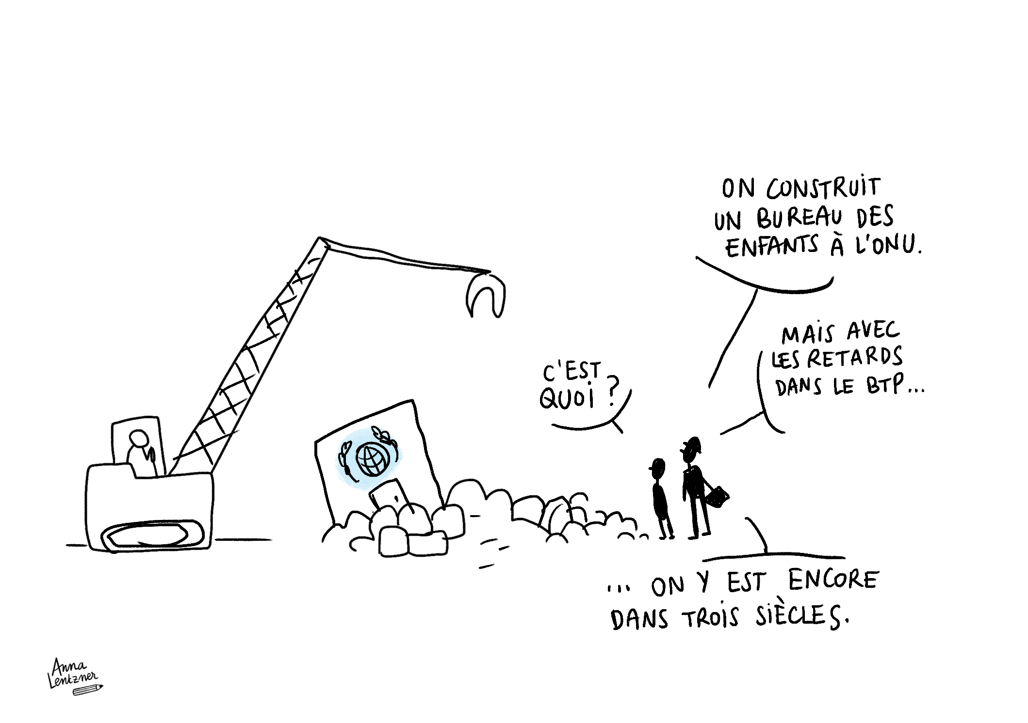 3. Enfin, j’ai terminé la journée par des dessins humoristiques type dessin de presse pendant les deux tables-rondes de l’après-midi. Cette dernière proposition a été particulièrement bien reçue. Pendant un temps plus institutionnel, les dessins réalisés avec humour ont permis d’introduire un regard décalé et de pointer les difficultés connues de tous. La projection en direct est un excellent moyen de soutenir l’attention d’un public fatigué par une journée de conférences. J’aime particulièrement le dessin d’humour qui surprend toujours le public – c’est une autre manière de marquer leur mémoire avec un message percutant.