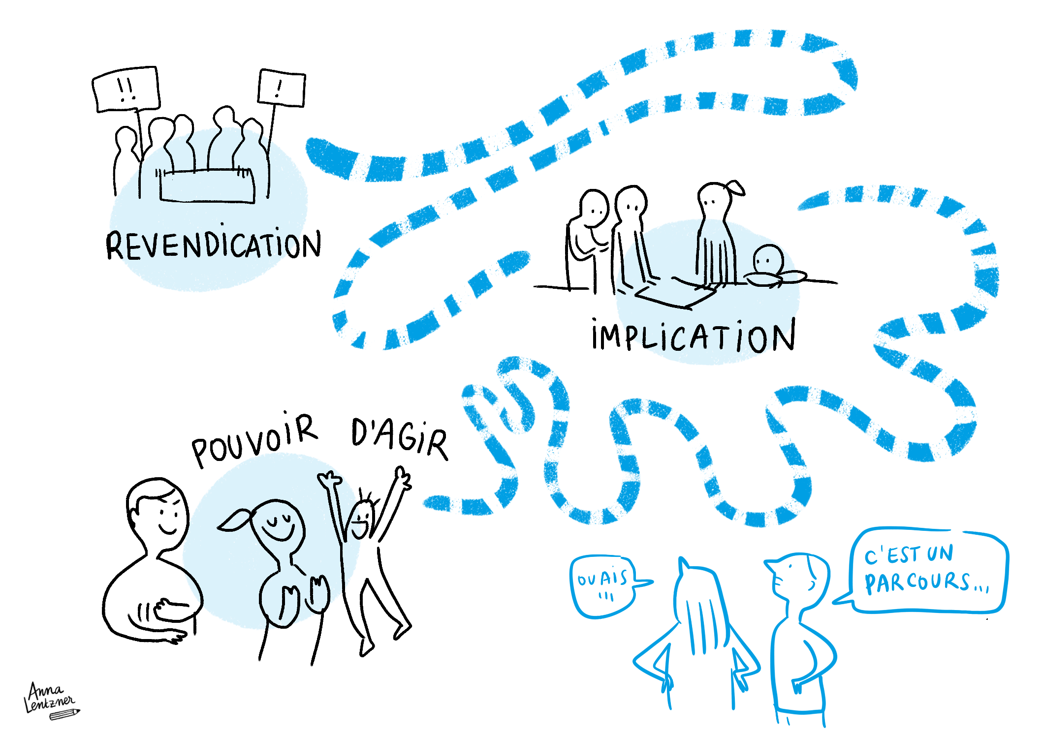 2. Ensuite, j’ai proposé un reportage dessiné pendant les ateliers en groupe. Cela me permet de donner à voir de nombreux sujets en un temps réduit. Je déambule parmi les ateliers et peux ainsi illustrer entre 5 et 10 ateliers selon le temps imparti. Les dessins sont ensuite affichés pendant un temps convivial – ici, la pause déjeuner. Cela permet aux participants de poursuivre les échanges de façon informelle, en évoquant les sujets illustrés.