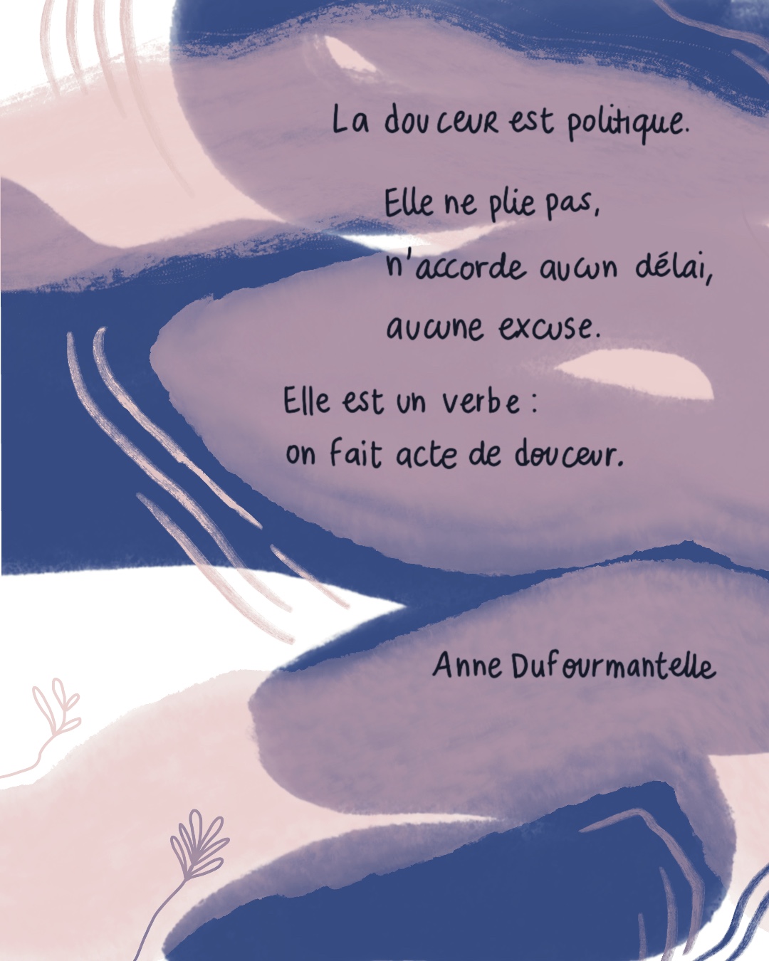 Pour cela, on m’a demandé de fabriquer une image pour accompagner cette phrase de la philosophe et psychanalyste Anne Dufourmantelle. Représenter la douceur, mais aussi le soin, la rencontre, l’exigence, la gentillesse. Alors j’ai retrouvé mes pinceaux, cherché les contrastes, fait de la découpe, et appelé Pauline Môme à la rescousse pour cette délicate animation.