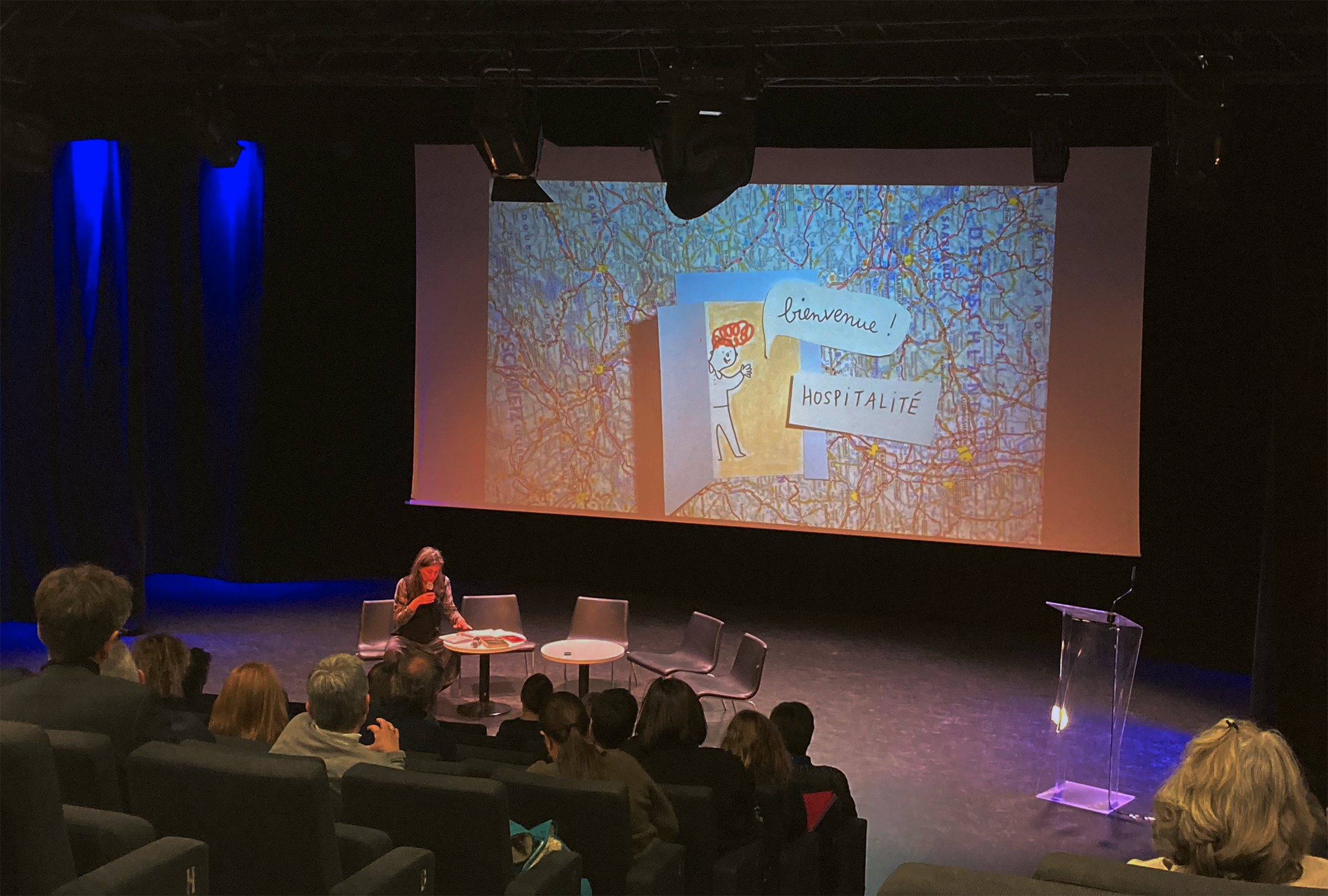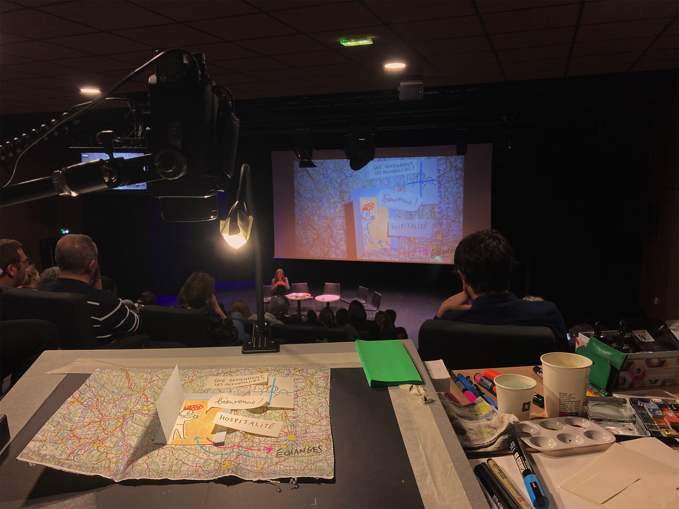✏️ un temps de restitution – spectacle : une nouveauté ! Prenant appui sur la restitution de la Grande Témoin, je dessine, découpe, bricole l’illustration de son propos, comme un décor qui se développe en fond de scène, filmé par ma caméra. Un temps plus doux et onirique pour permettre l’atterrissage des participant-es en cette clôture de journée.