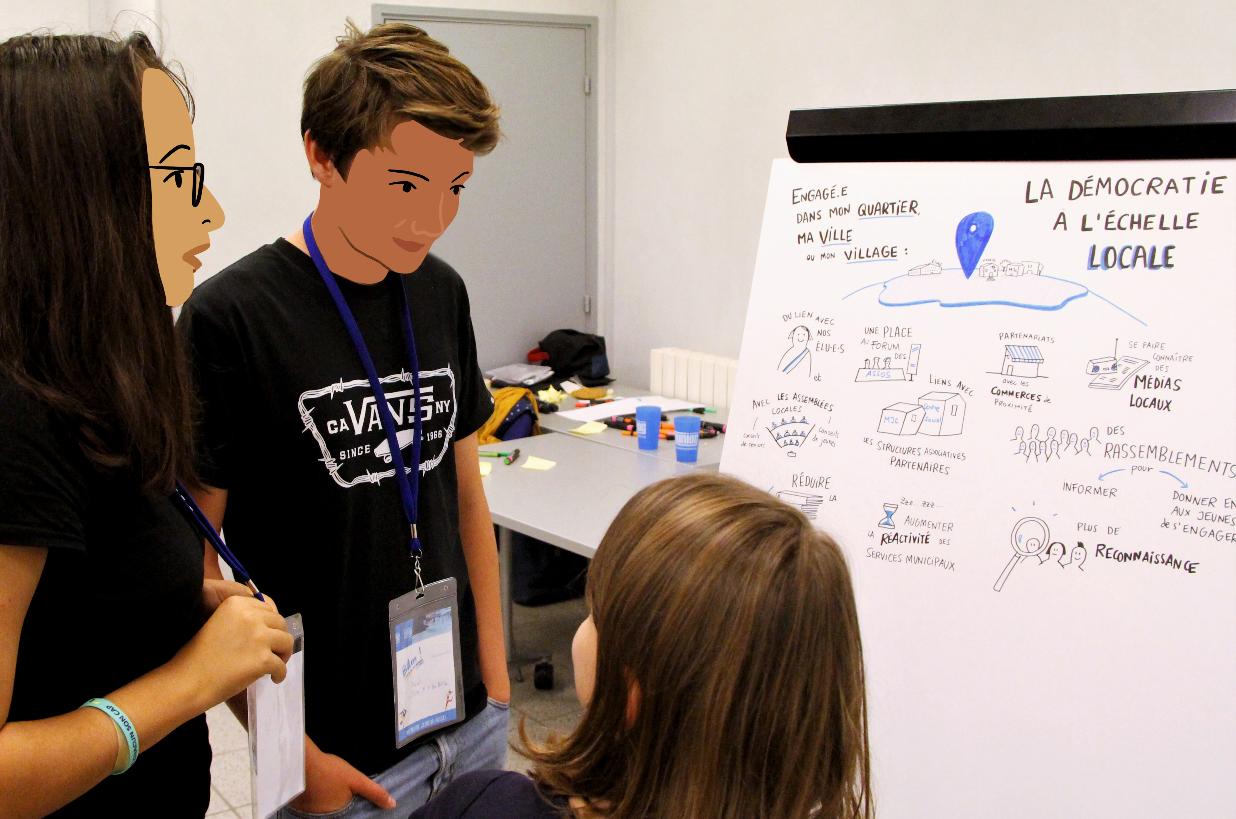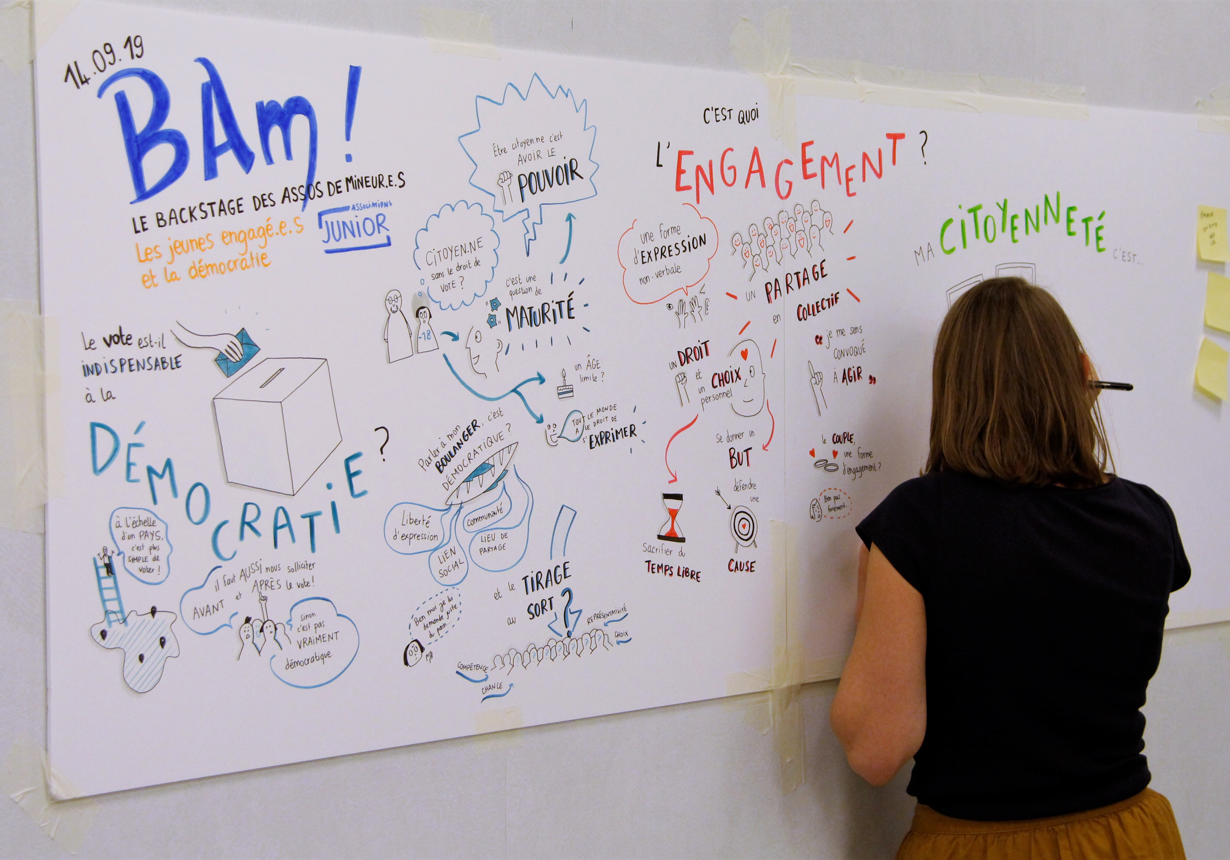 A l’occasion d’une rencontre de jeunes associatifs engagés, organisée par le Réseau national des Juniors Association, je suis venue capturer l’événement sous plusieurs formes de facilitation graphique : fresque murale, scribing d’un atelier, dessin en direct.