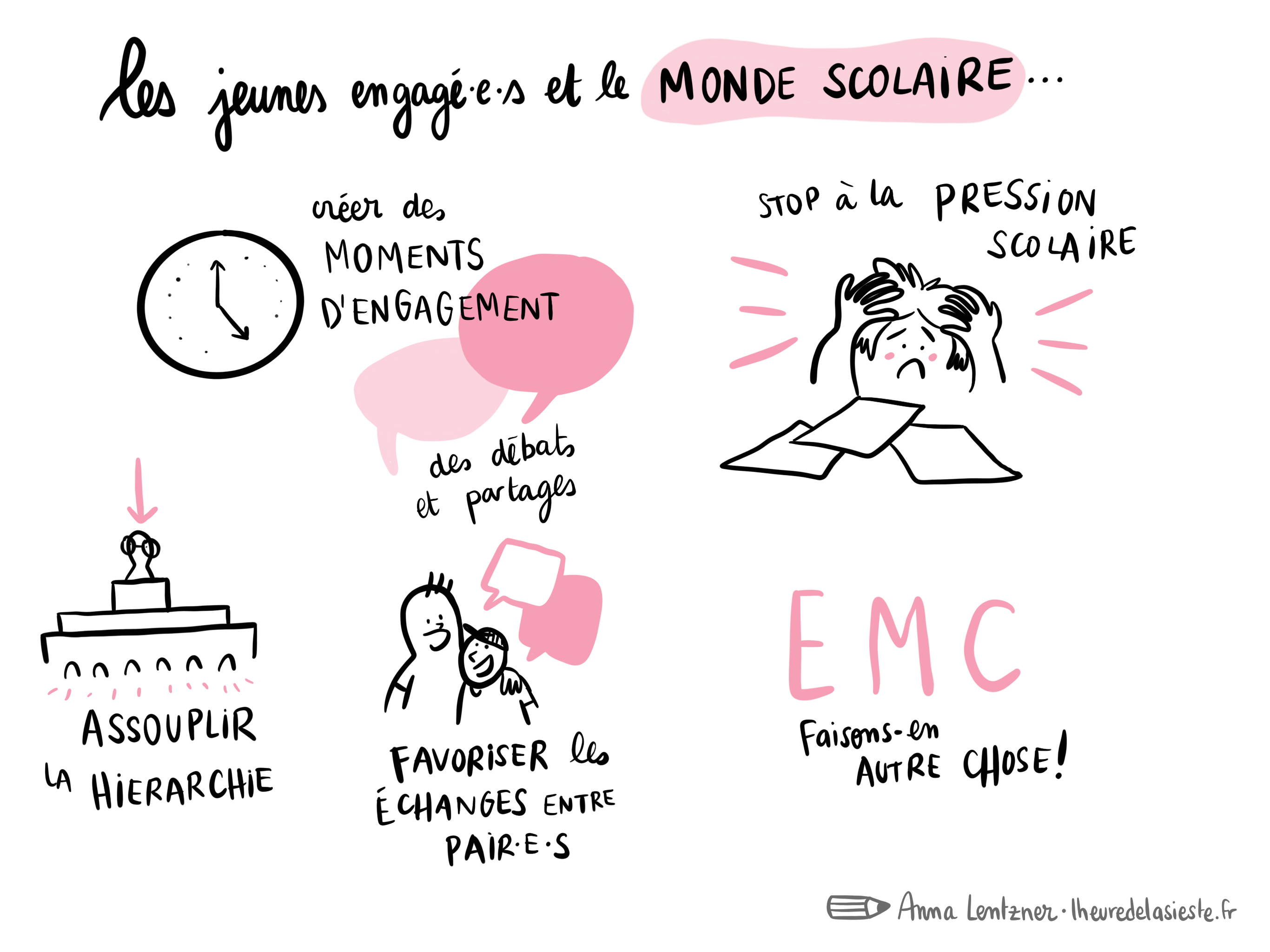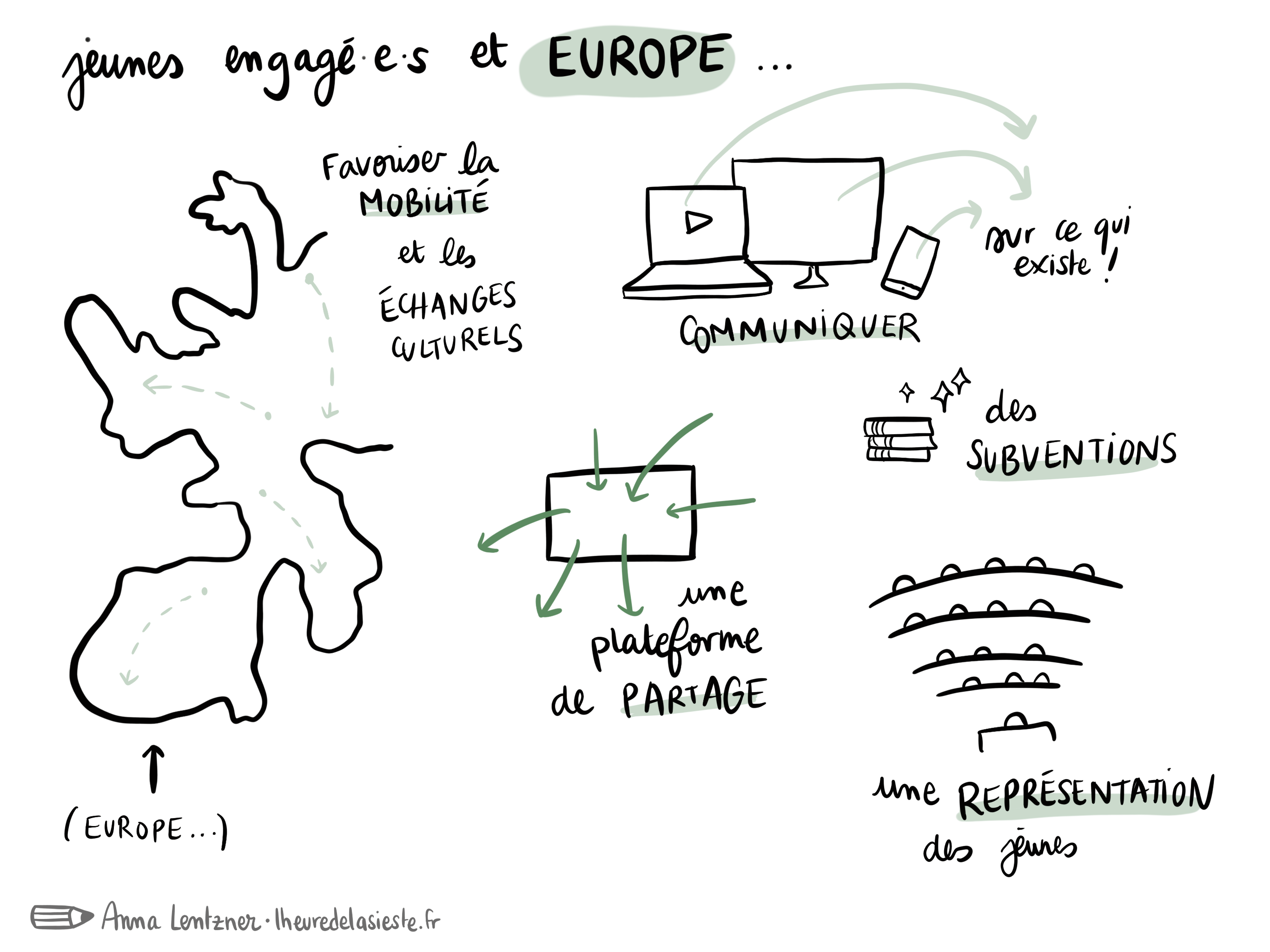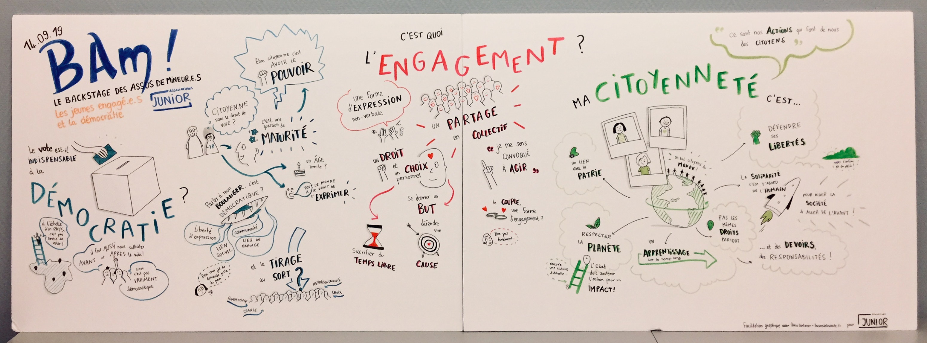 1. J’ai réalisé une fresque pendant une matinée de débats autour des thèmes de l’engagement, de la démocratie et de la citoyenneté. Cette forme de facilitation graphique permet de donner à voir en un coup d’oeil les grands thèmes d’un événement, ou de faire le récit d’une journée de travail.
