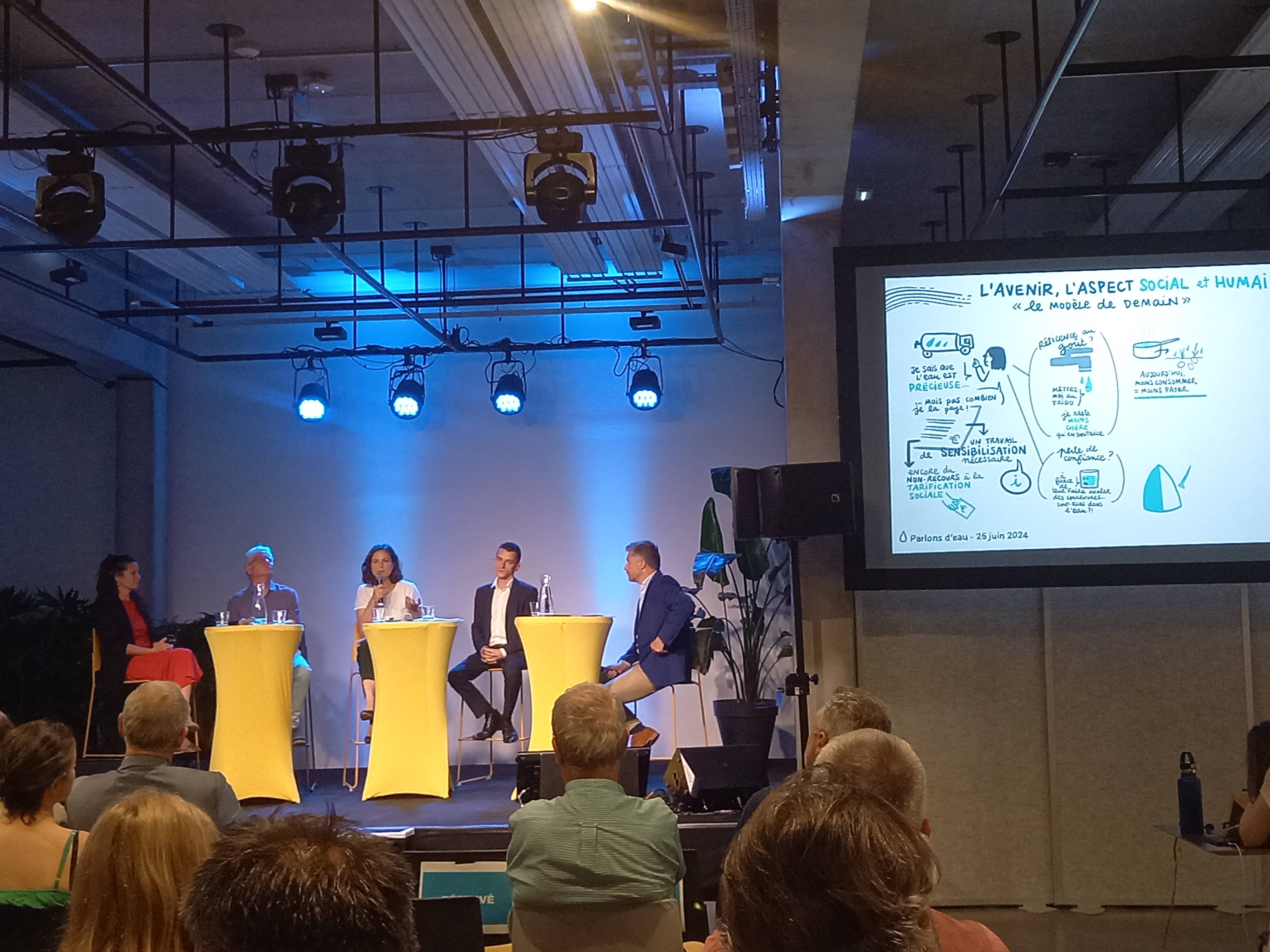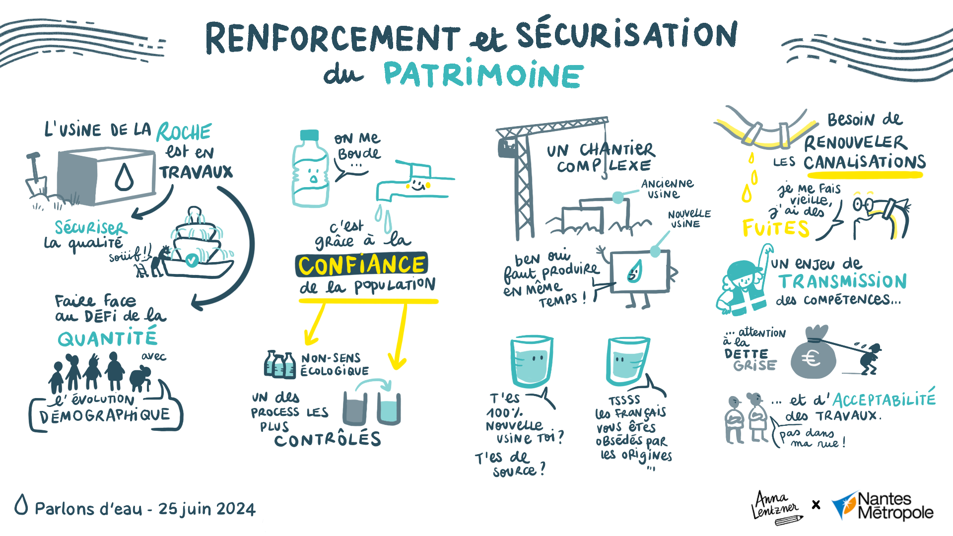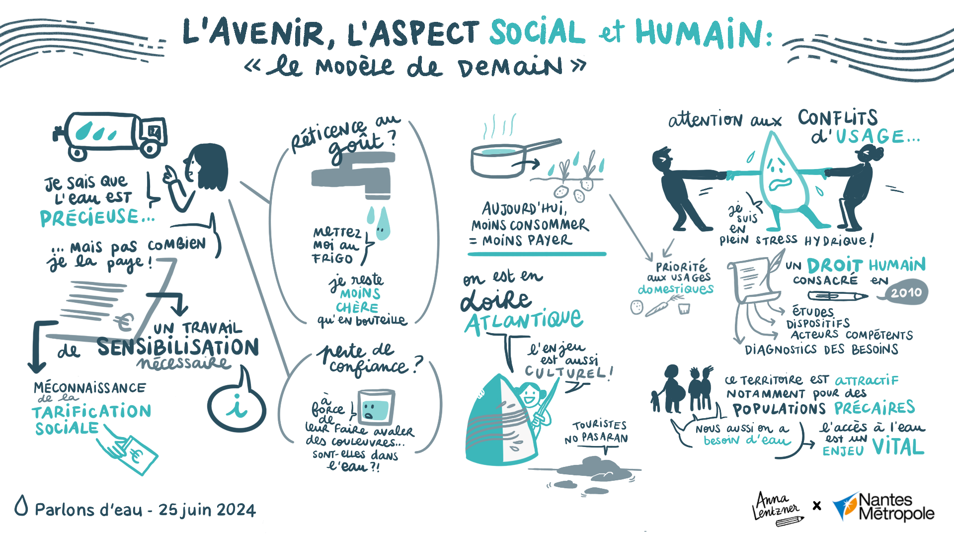 En juin 2024, j’ai été sollicitée par l’agence de concertation Sennse pour traduire en dessin une conférence organisée par Nantes Métropole. Au programme, trois tables-rondes pour aborder différents aspects de la gestion de l’eau par la collectivité, avec une vision prospective.