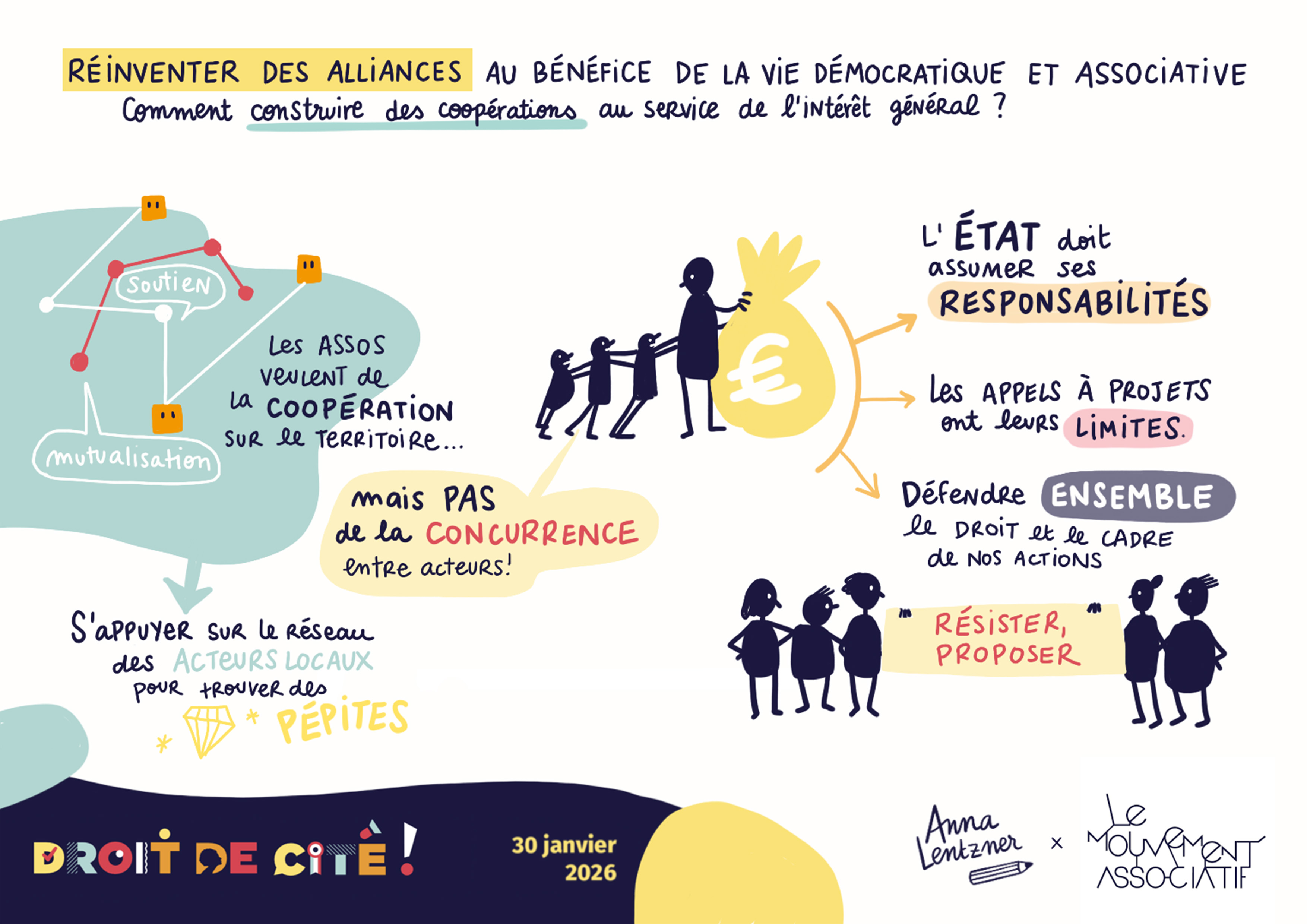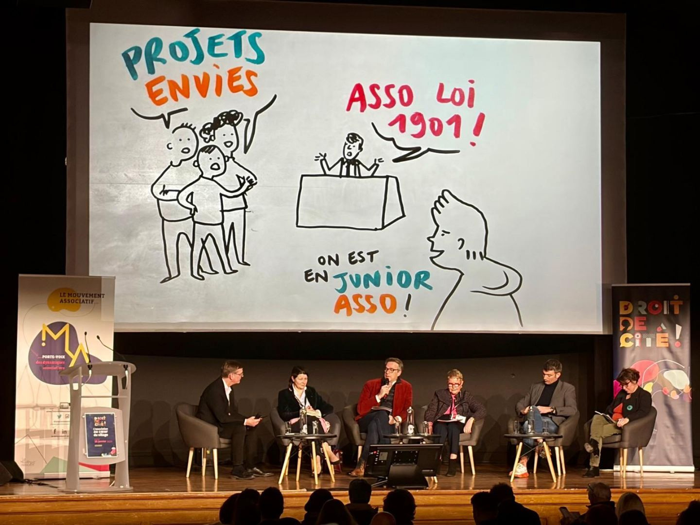 Pour la 4ème édition de Droit de Cité ! (édition 2026), j’ai accompagné en dessin Le Mouvement associatif. C’est un événement que je connais bien, pour y être intervenue déjà à plusieurs reprises : le programme est très dense, et le dessin doit permettre d’apporter de la respiration, voire un soutien à la concentration, particulièrement en fin de journée.